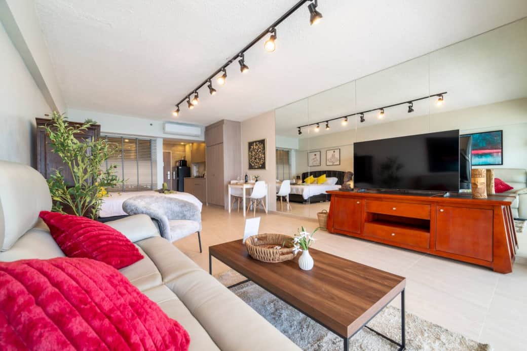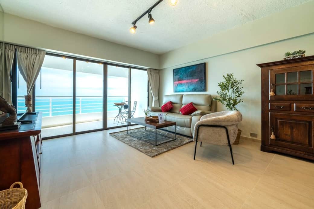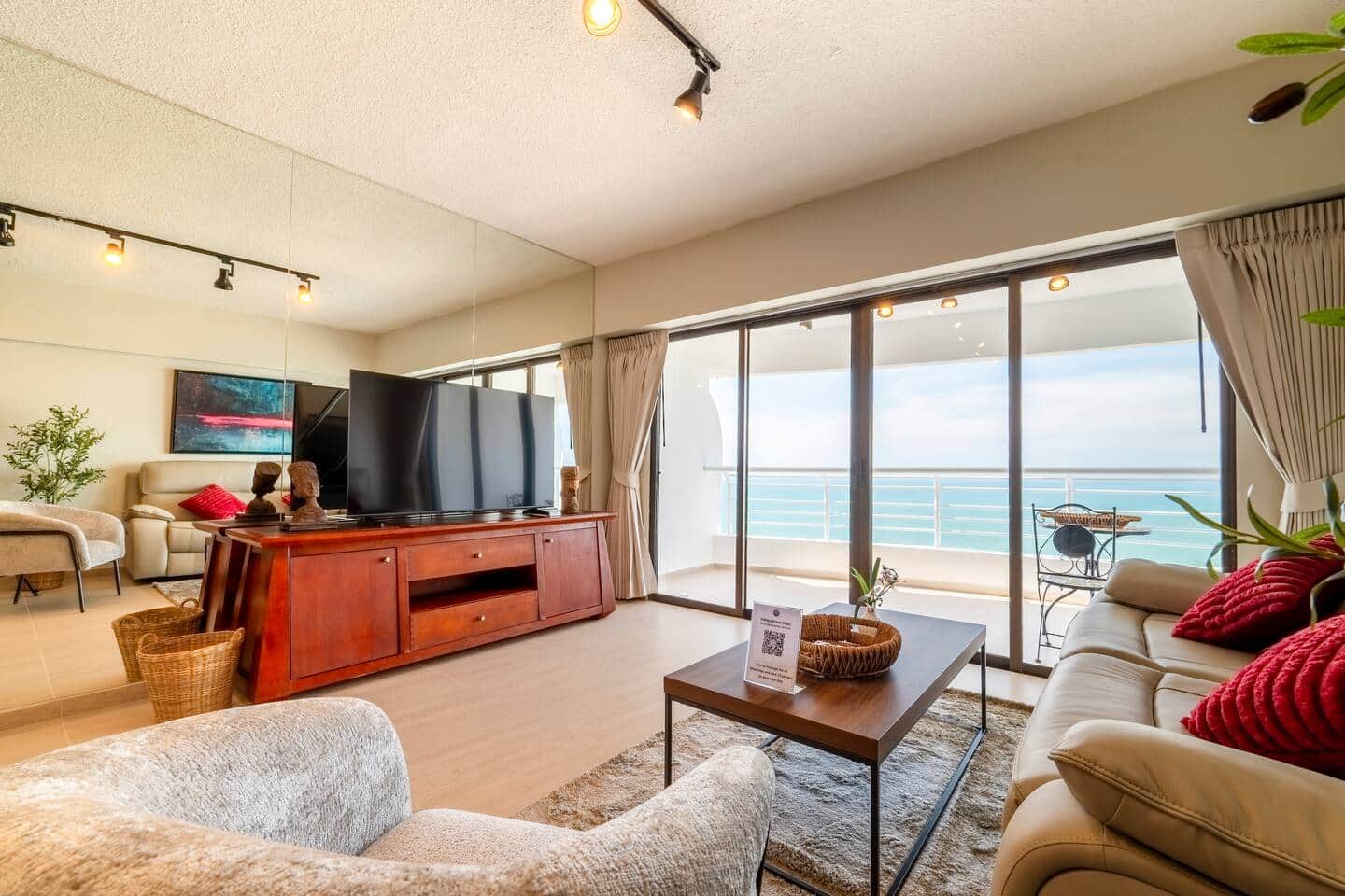 Our living room is cozy, stylish, and fully equipped with everything you need for a perfect, relaxing vacation — all while facing the blue ocean.